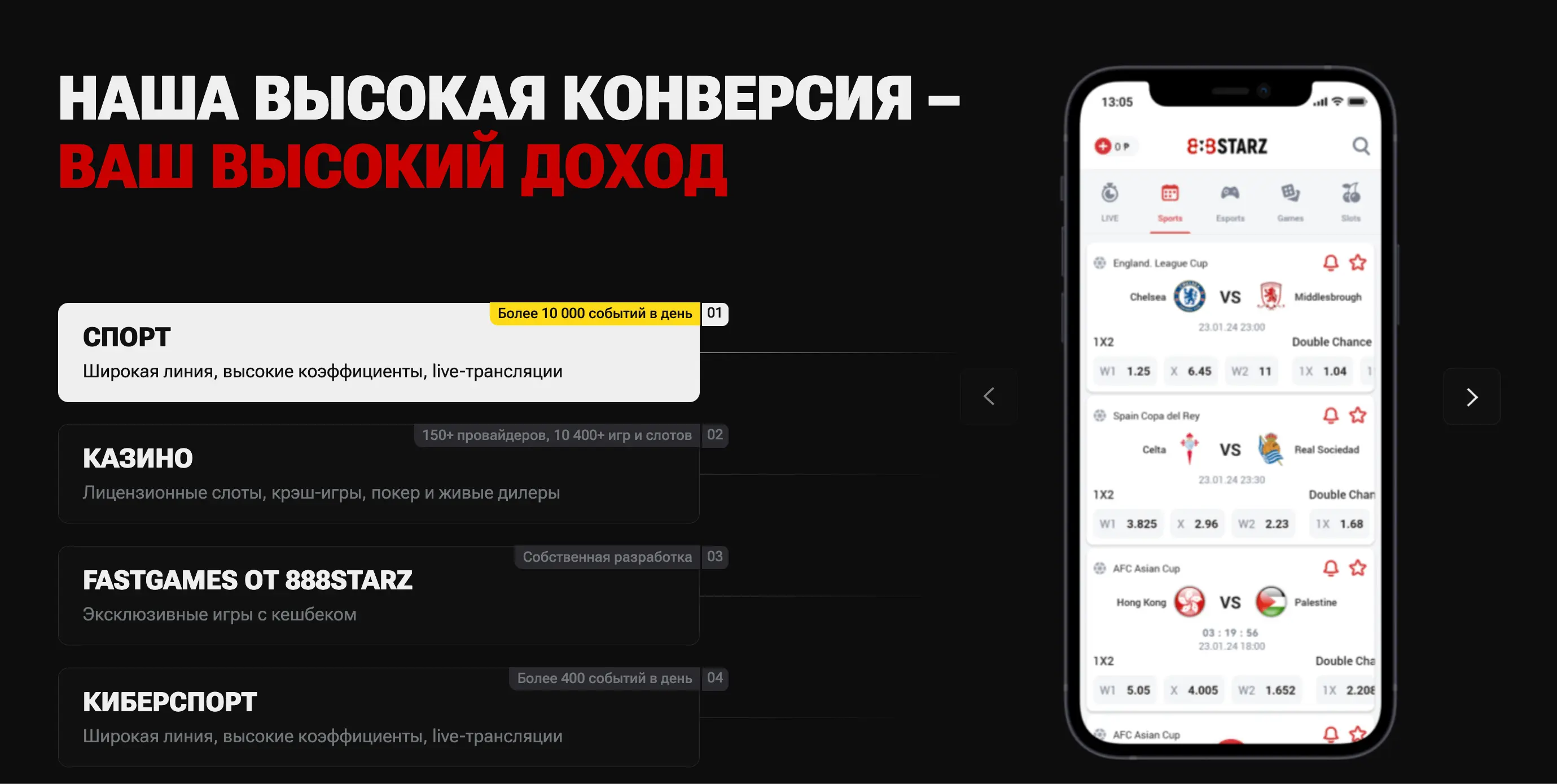 888STARZ Partners - это прямая iGaming-партнерка от одноименного бренда (беттинг + казино), которая за несколько лет нормально закрепилась на рынке и сейчас активно забирает трафик по Tier-2/3 и не только.