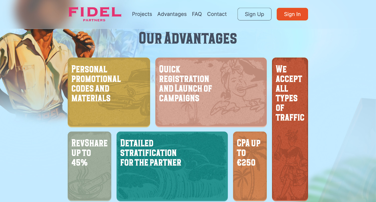 Fidel — это международная партнёрская программа, специализирующаяся на игровых брендах с широким спектром возможностей. Сейчас Fidel Partners предоставляет доступ к аудитории в Бразилии, а вскоре планируется расширение на такие страны как Нигерия, Мексика, Германия, Швейцария, Франция, Австрия, Португалия и Канада.