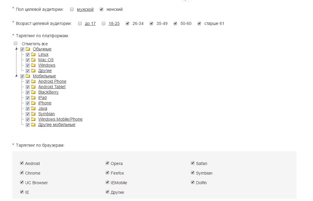 Категории выбрал только те, в которых сидят взрослые женщины. Цену за клик поставил 2 рубля. Конечно, можно было выбрать и больше категорий. Оставлю это для вас :)
