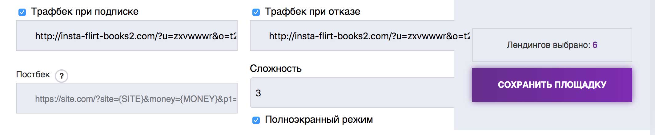 Здесь же можно установить постбек и настройки сложности подписки.
