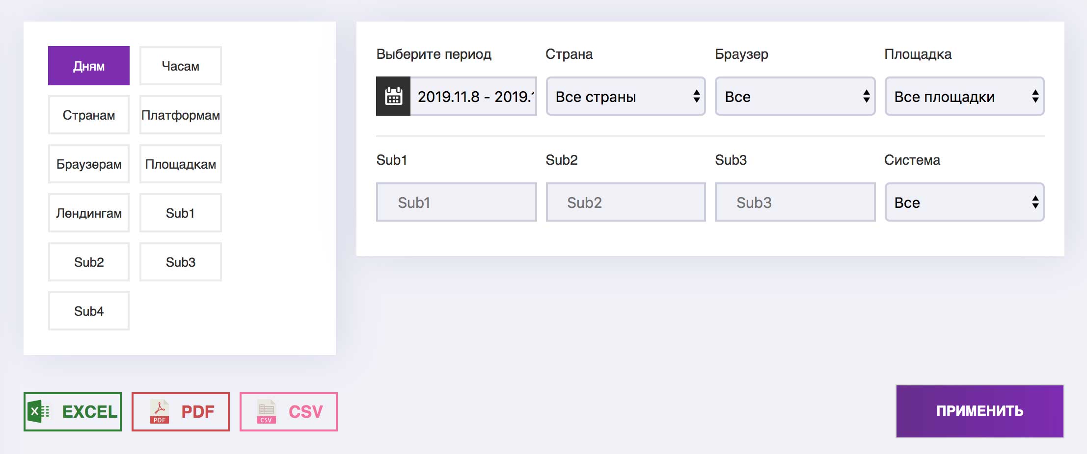 Есть возможность отслеживать все необходимые параметры, включая SubID Ваших источников. Так же статистику легко можно выгрузить в EXCEL PDF или CSV